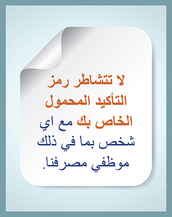 إننا وبموجب خدماتنا المصرفية عبر الإنترنت، لا نطلب منك معلومات مالية (رقم الحساب أو العميل أو البطاقة الإئتمانية إلخ.) أو معلومات شخصية (كلمة السر أو كلمة المرور أو شهرة والدتك قبل الزواج إلخ). حفاظاً على أمن وسلامة حسابك يُرجى وبكل تأكيد عدم إعطاء أي إعتبار للرسائل الإلكترونية التي تطلب منك معلومات من هذا القبيل وعندمتا تتلقى رسالة إلكترونية من هذا النوع نرجو أن تقوم وفي أسرع وقت بإبلاغ مصرفنا بالأمر من خلال الفرع الذي تتعامل معه. فمن خلال عبارة ترحيب تقوم أنت بتحديدها يمكنك أن تتحصن من تهديدات أية مواقع مزيفة والتحقق من أنك بالفعل في الخدمات المصرفية عبر الإنترنت الخاصة بمصرفنا. بفضل شريط العنوان الأخضر يمكنك التأكد من إعتماد هوية موقع الإنترنت الذي تدخله وإن الإتصال آمن تماماً. فأثناء تسجيل دخولك إلى الخدمات المصرفية عبر الإنترنت لمصرفنا يُرجى التحقق مما إذا كان شريط العنوان أخضراً. لإستخدام شبكة الإنترنت بشكل أكثر أماناً، ضع حاسوبك الآلي تحت الرقابة والسيطرة من خلال برامج الفيروسات المُحدّثة وبرامج مكافحة أحصنة طروادة.